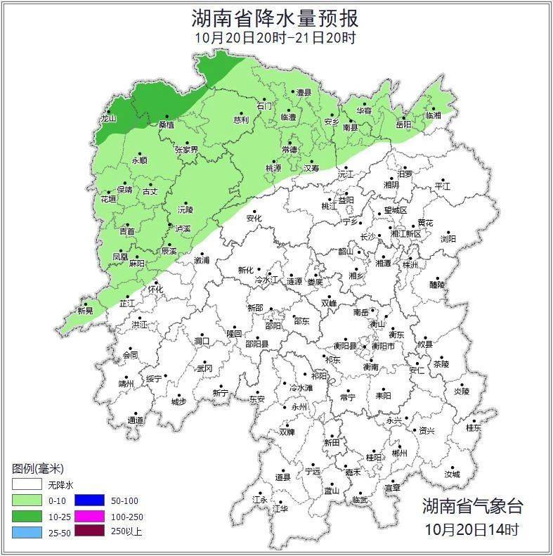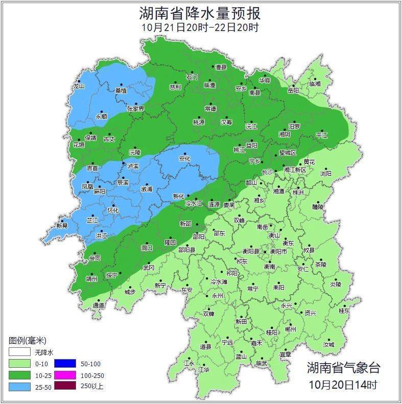 10月21日(ri)早晨(chen)到(dao)22日(ri)日(ri)间,湘中、湘北小(xiao)到(dao)中雨转多云,其中湘西州、张家界西部、怀化中北部、益阳西部、邵(shao)阳北部、娄底西部部分大雨,其他地区(qu)多云转小(xiao)雨;寒风(feng)3~4级;最(zui)高(gao)气温20~22℃;最(zui)低气温湘西、湘北12~14℃,其他地区(qu)15~17℃。