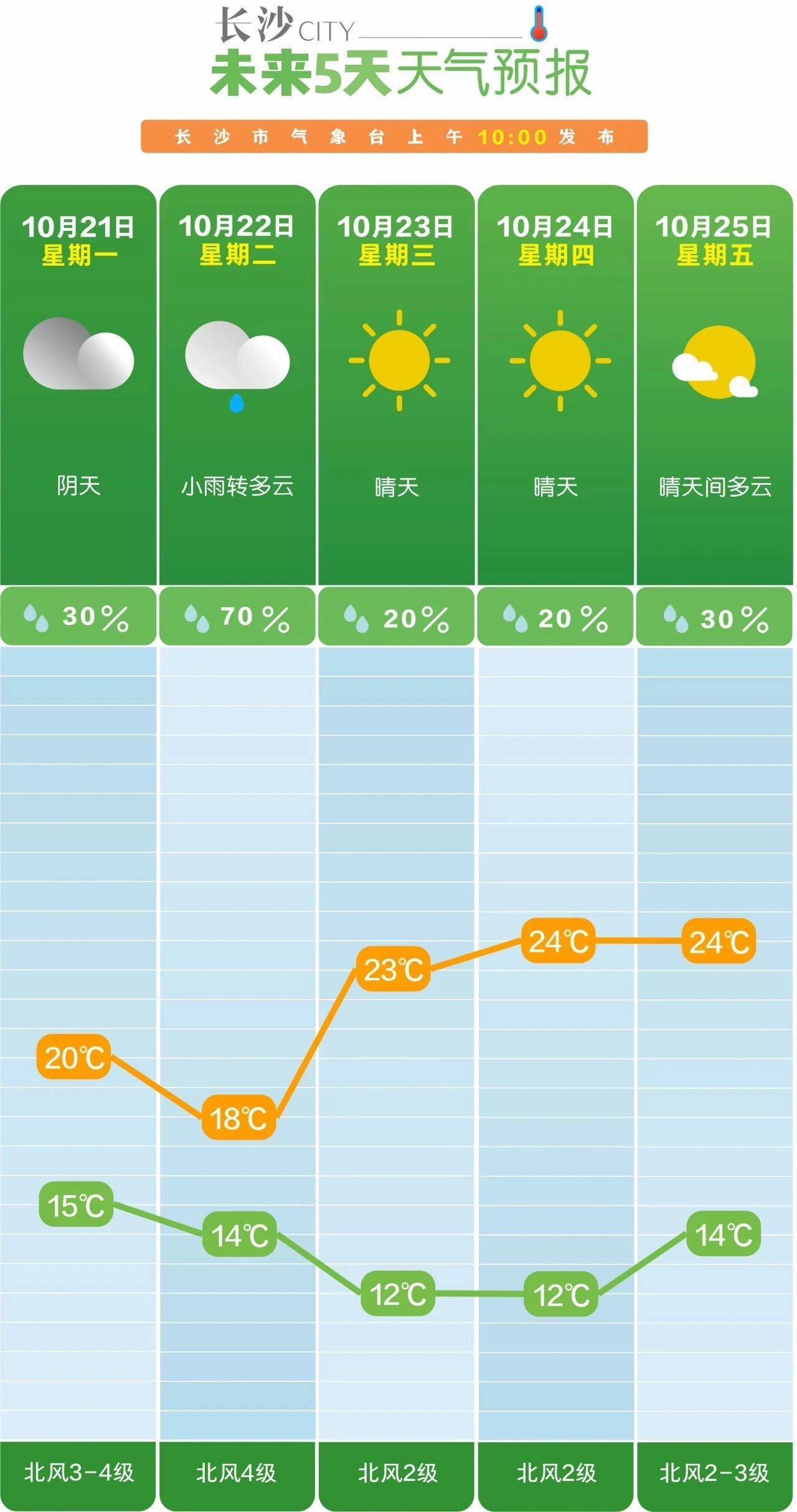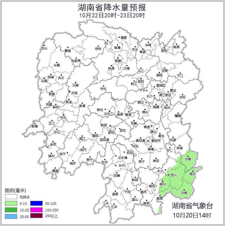 10月22日(ri)早晨(chen)到(dao)23日(ri)日(ri)间,湘东南(nan)阴天转多云,部分地区(qu)有阵雨,其他地区(qu)好天间多云,23日(ri)早晨(chen)部分地区(qu)有雾;湘南(nan)寒风(feng)3~4级,其他地区(qu)寒风(feng)2~3级;最(zui)高(gao)气温20~22℃;最(zui)低气温12~14℃。
